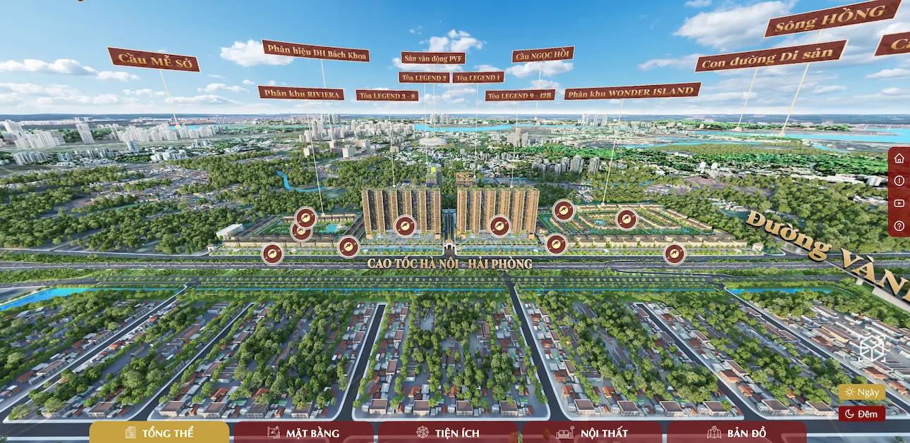 • Chuyển đổi khu vực: Nhấp vào các điểm nóng (hotspots) trên màn hình để di chuyển nhanh giữa các phân khu khác nhau hoặc vào bên trong căn hộ mẫu.